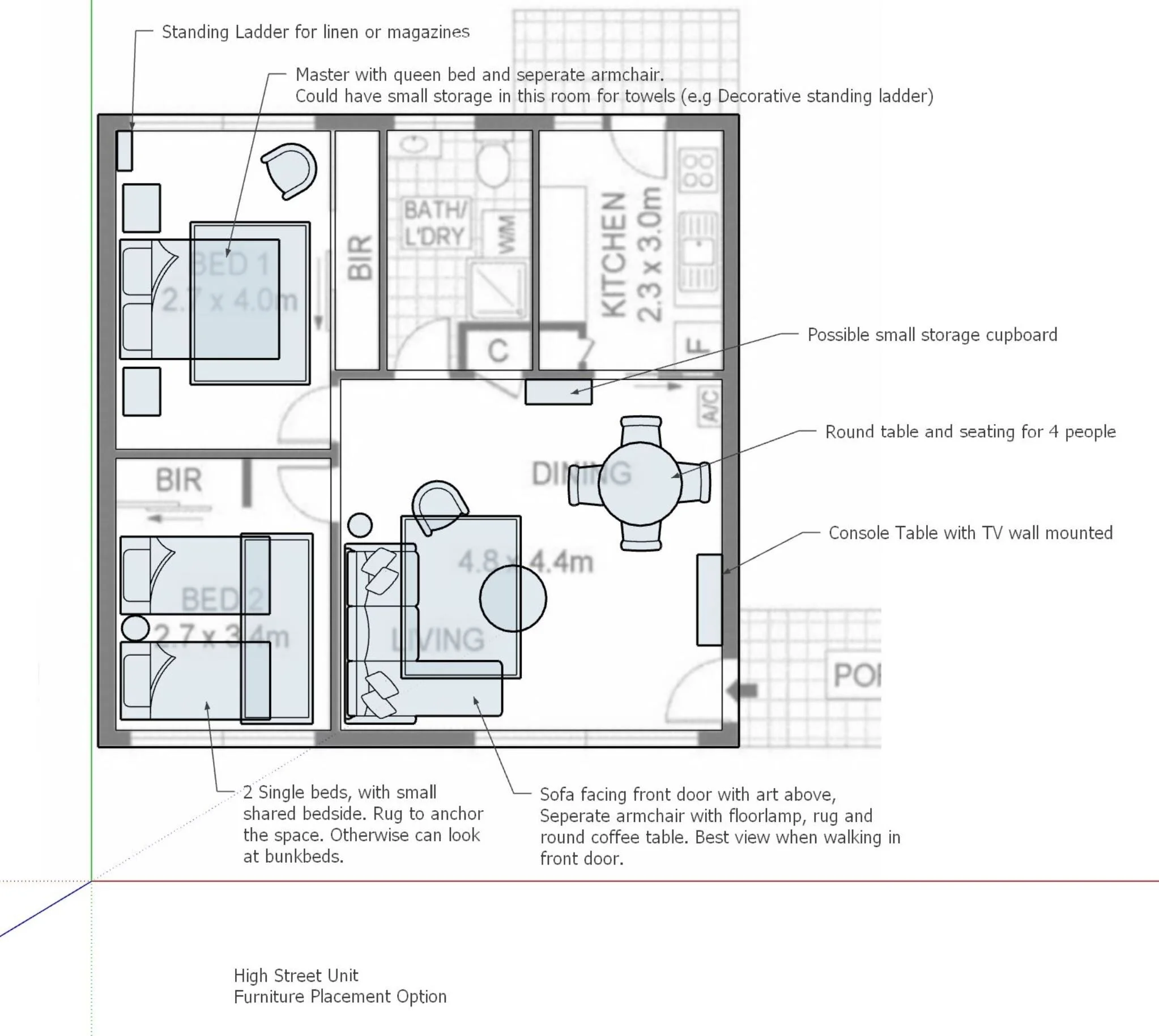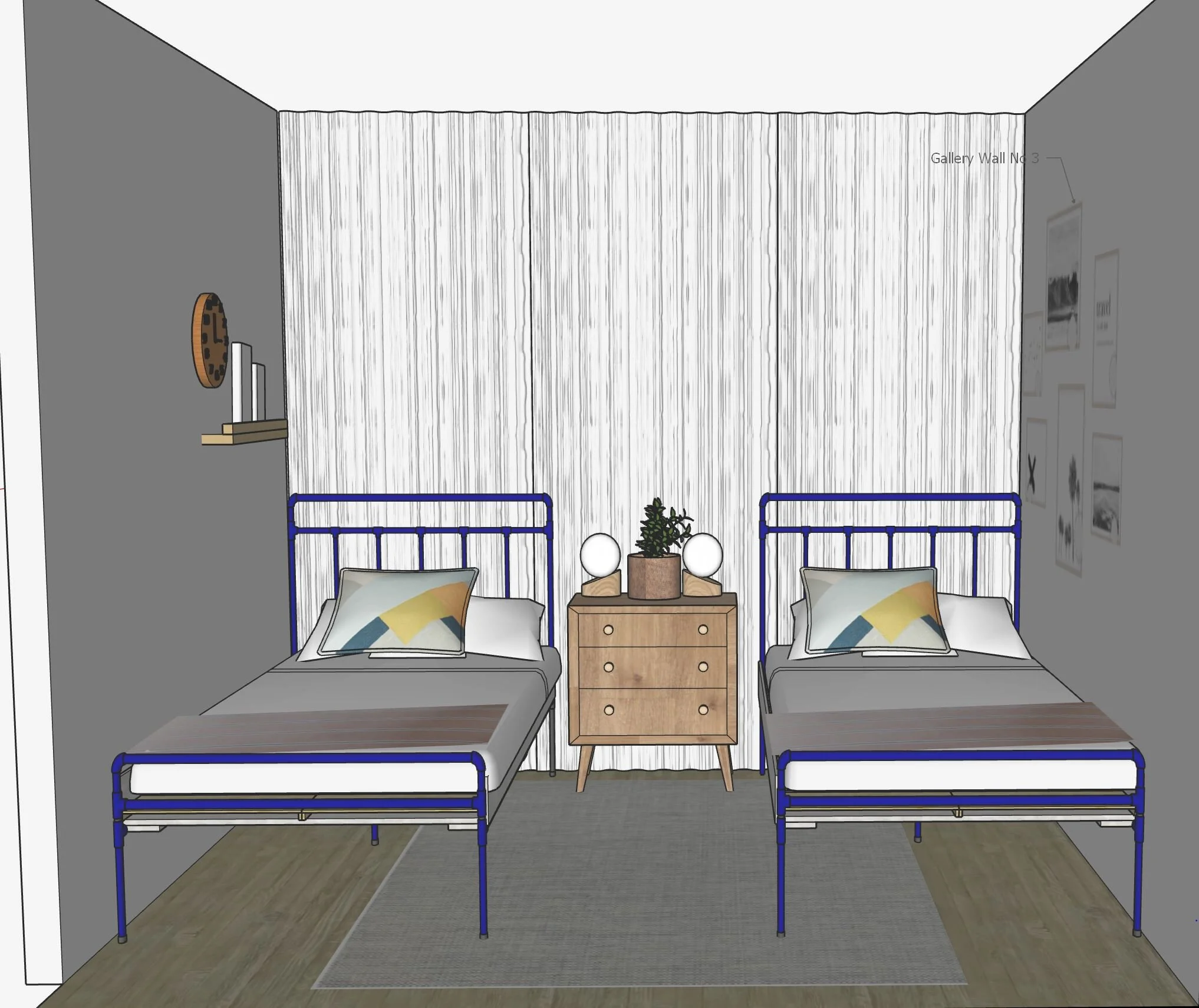 Here’s a look at my initial suggested floorplan drawing. The bottom left room is the guest room, and I originally had the beds orientated along the solid bessa brick wall. When I actually spent time in the space though, I decided it felt more spacious having the beds running along the window wall. Looking at a floorplan is one thing but getting an actual feel for the space makes all the difference!