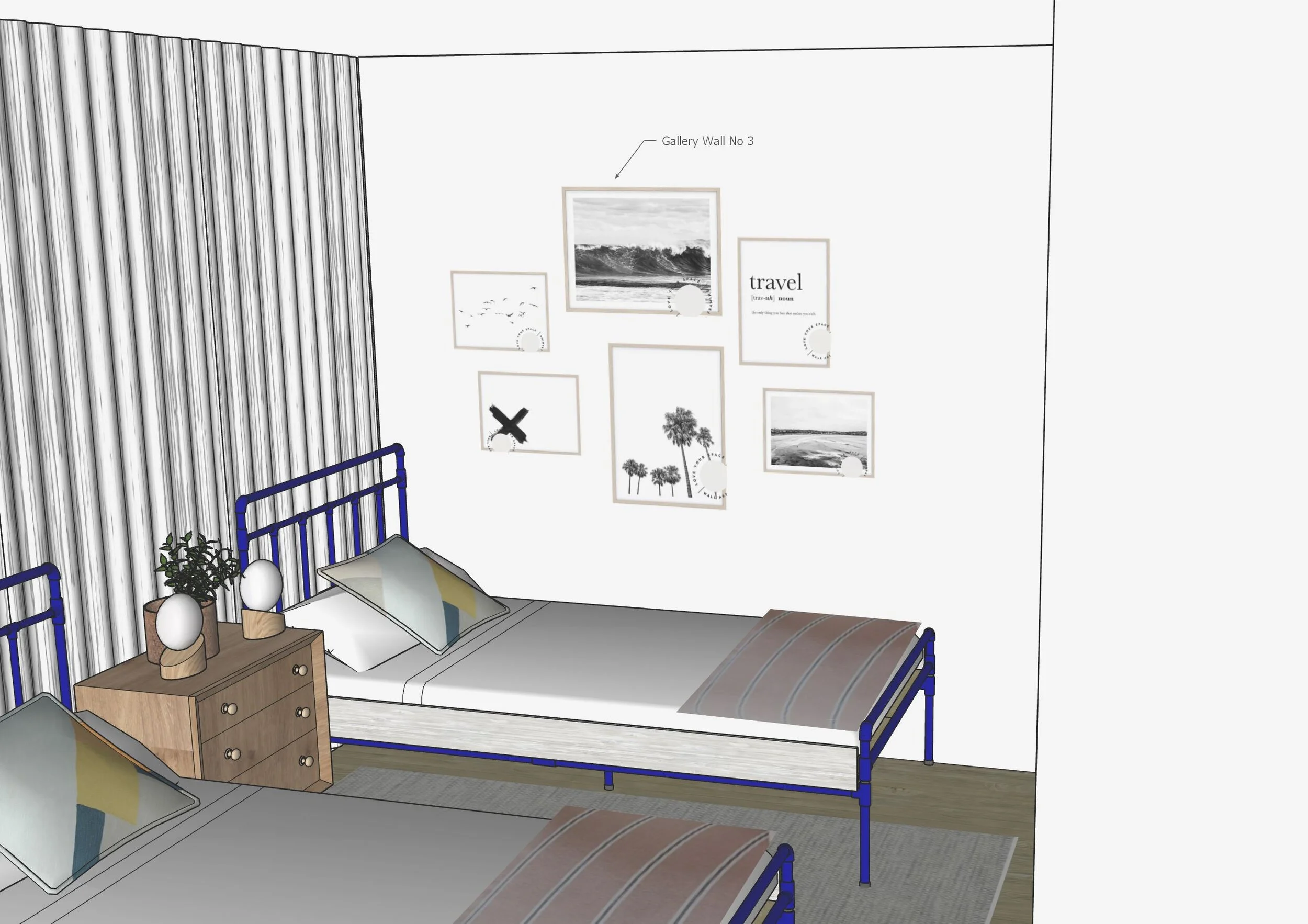 Here was the plan for how the guest room could look when guests entered the space. Having a feature gallery art wall that people would notice as soon as they enter the room adds interest and personality so effectively. Aesthetically it was all about adding some colour into the room with deep navy beds and sage green and rust bed linen. For this to work, without over powering an otherwise quite muted space, I chose to keep the art work black and white with matching frames and a neutral toned rug and curtains.