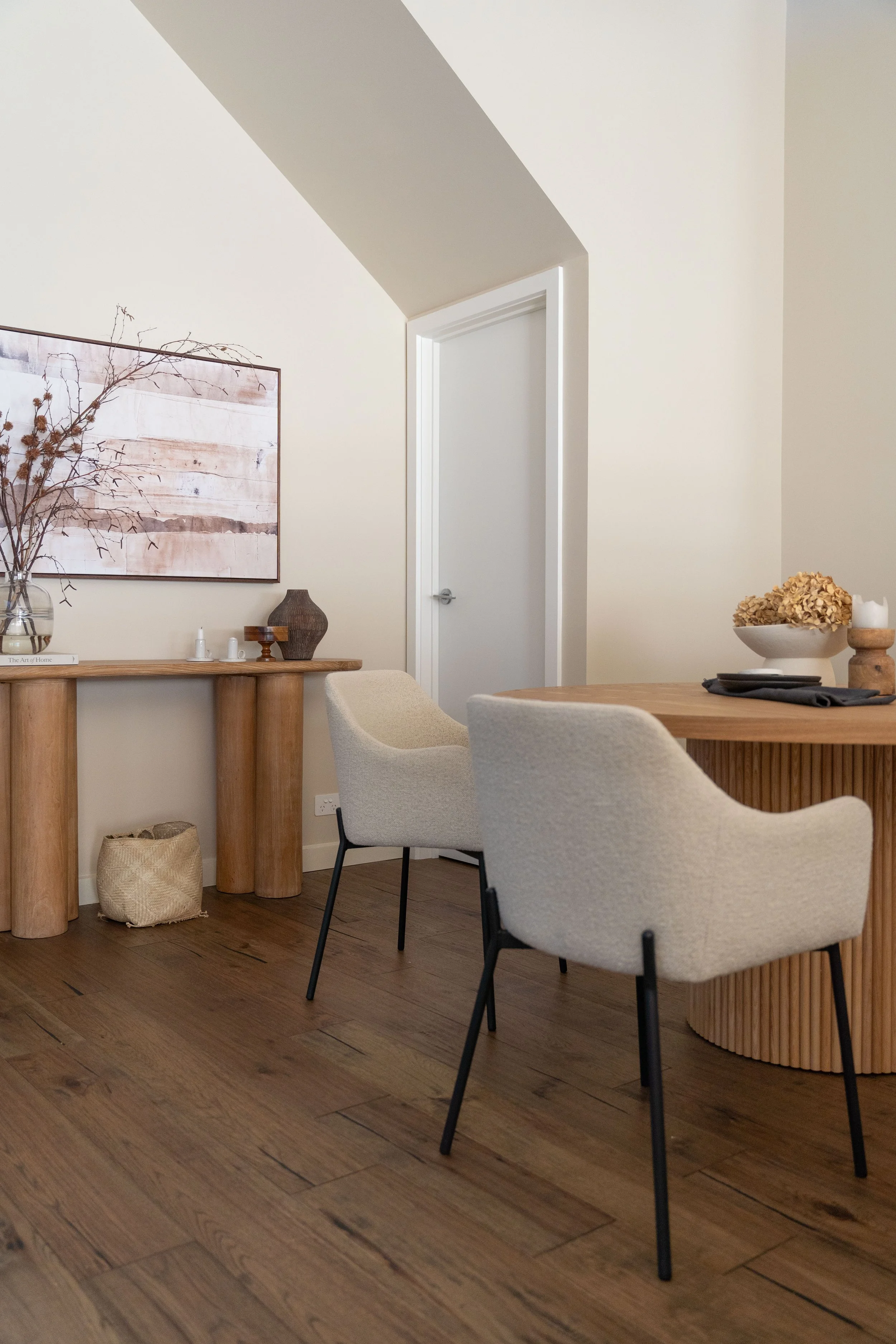 Before we began furnishing the space, the townhouse underwent a complete interior refresh. We repainted throughout, replaced the flooring with engineered timber, laid textural loop pile carpet upstairs, and had custom s-wave sheers installed.