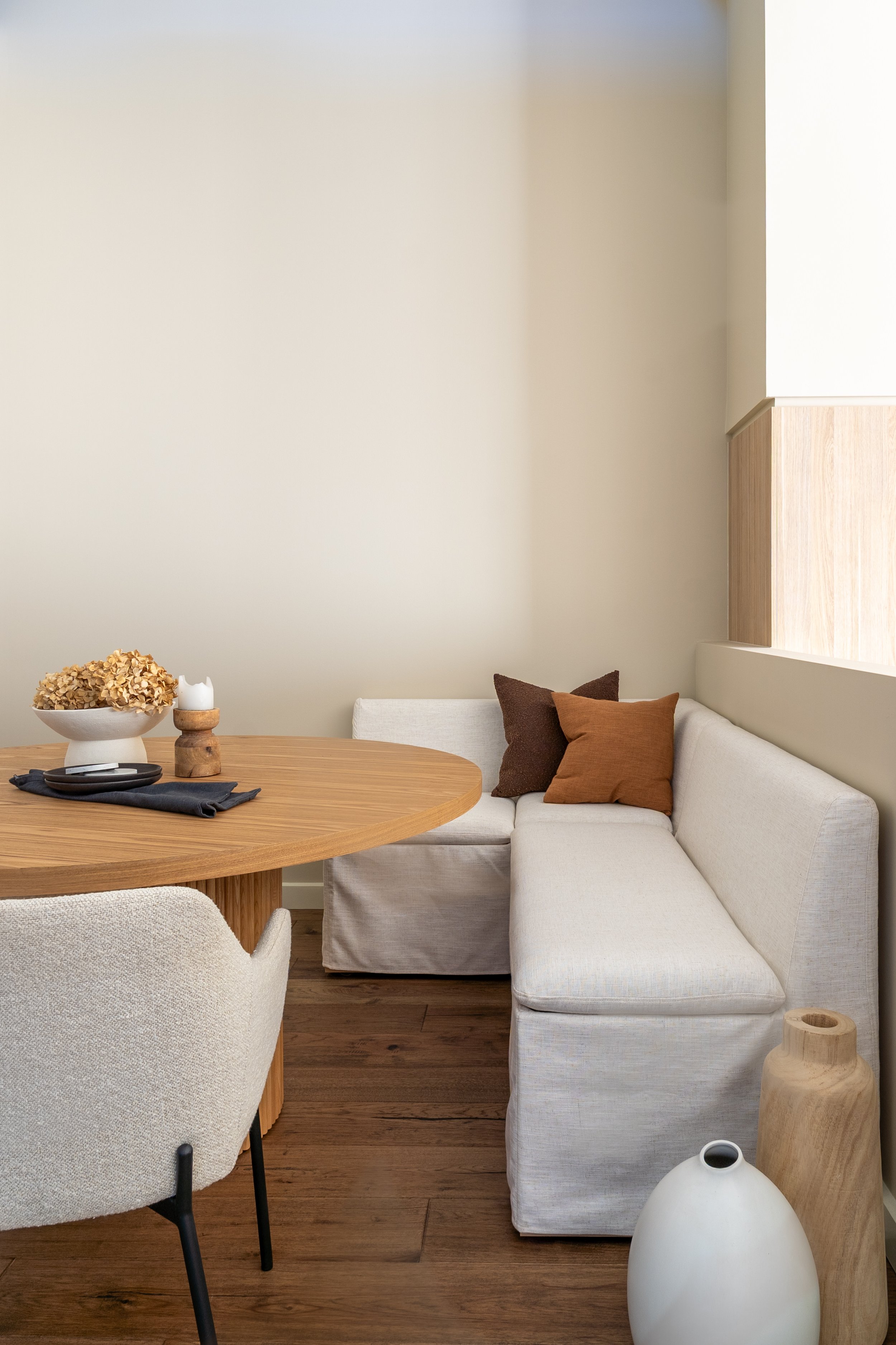 The dining nook is a favourite — a quiet spot to start the morning and watch the day unfold. Its layers of linen and timber make it feel relaxed and purposeful.