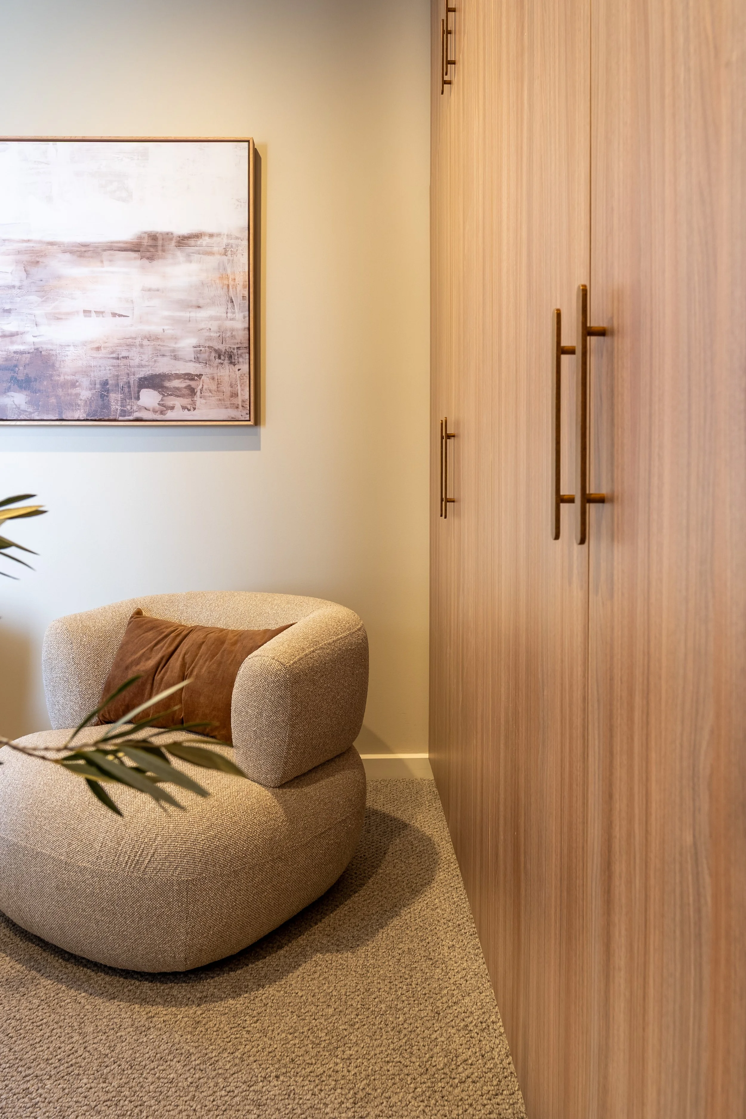 In the living area, warm vertical panelling creates a beautiful sense of warmth and texture. The joinery adds both practicality and a sculptural element that helps to anchor the tall ceilings, while the soft sheers diffuse all the beautiful natural light that comes into this room.